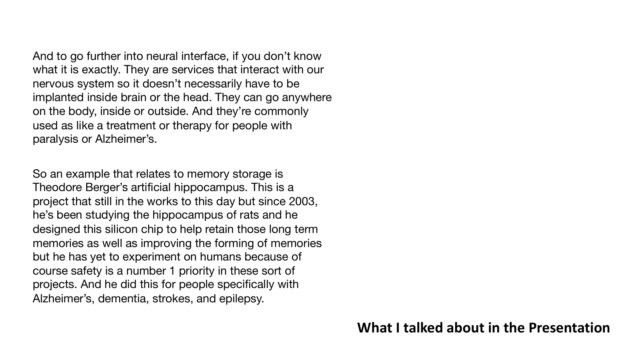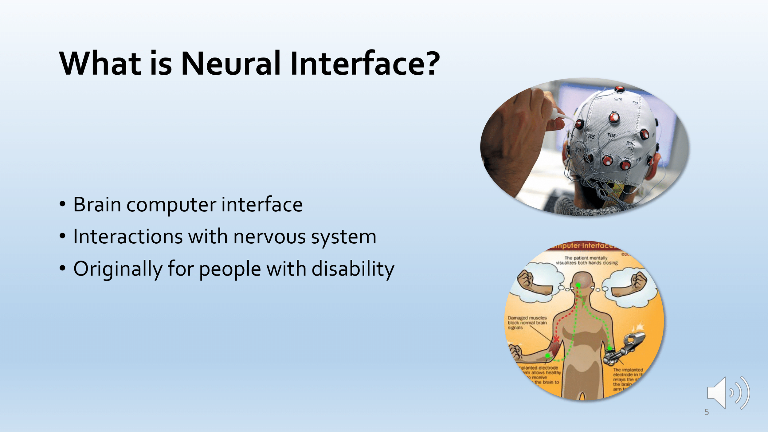 The key takeaway from this project is that we should value what we have whether it be our ability to retain memory, to be able to walk, or to communicate with others. And that we should live our lives to the fullest since we don’t know how long it will take until Elon Musk or anyone else will release a final iteration of digitizing the brain. Lastly, another takeaway is that neural interface is not a bad thing. In fact, it is something that people rely their lives on for their daily interactions. And what we’ve seen from the research and my scenario is that neural interface does give a second chance for the users, it gives them opportunities that they may have thought they would never see or have again in their lives. I believe in the future that neural interface will skyrocket and be available to everyone just like how we have easy access to phones or computers. So, I think this new learning will be helpful for me by helping me adjust to new life-changing technology in the future as I age and have the potential to encounter neural interface in my life.