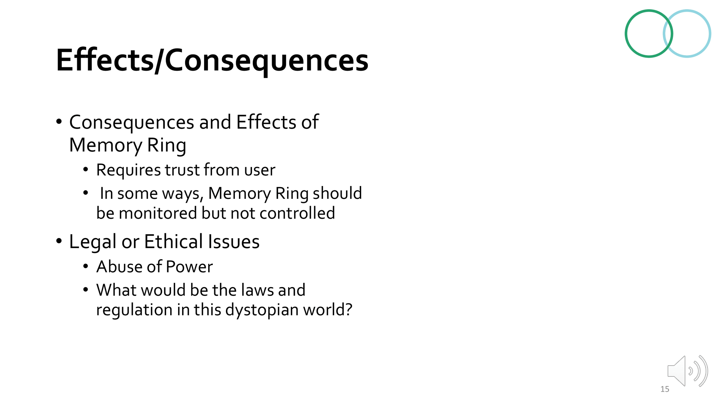 My yay moment is that I was able to gather my research so that I could create a believable dystopian service and I was able to look in on the different perspectives based on the frameworks from my project documentation report. For me, this service was not unbelievable but rather obtainable, because we have seen many similar products/projects on the internet that try to strive for this end goal. And the thing about the Memory Ring is that it doesn’t really exclude or discriminate against them except for the fact that only people over 18 can choose to use the service or not. However, the point is that the Memory Ring can be of service to anyone. It is not looking for a specific race, gender, or class. All it really needs to function is a conscience.